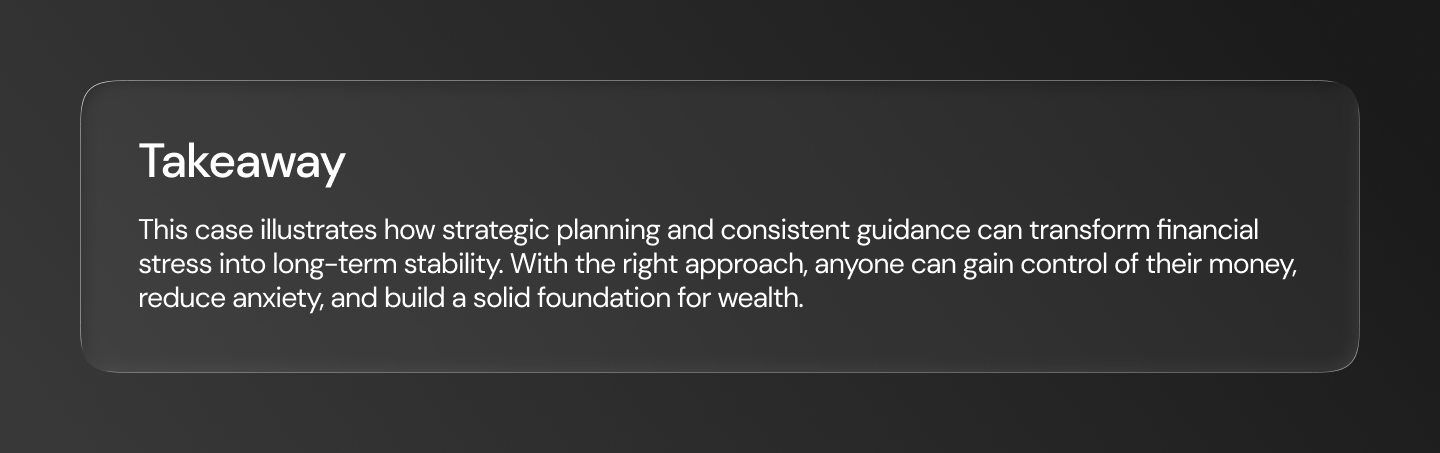 We established automated savings routines and introduced liquidity tier planning. This ensured she could handle short-term emergencies while building long-term security.